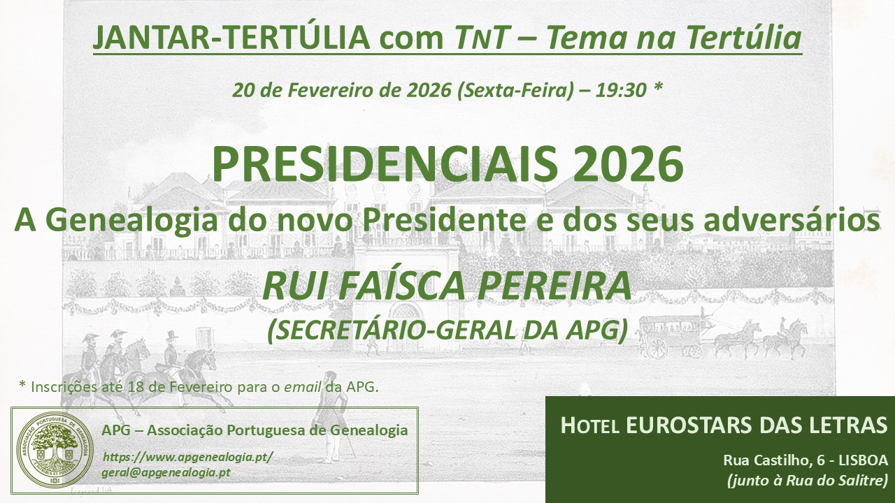 21-03-2025 (6.ª F.) – Jantar-tertúlia mensal de Março com TnT – TEMAS na TERTÚLIA, em que Maria de Lurdes Rosa apresentará o tema “As potencialidades do projeto VINCULUM para os estudos genealógicos”.