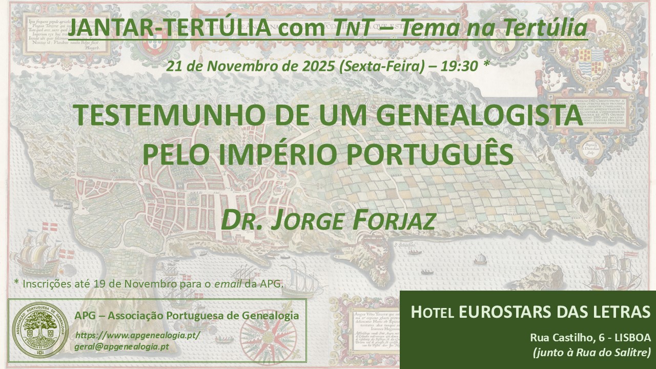 21-11-2025 – Jantar-tertúlia mensal de Novembro, em que Jorge Forjaz apresentará o tema “Testemunho de um Genealogista pelo Império Português”.