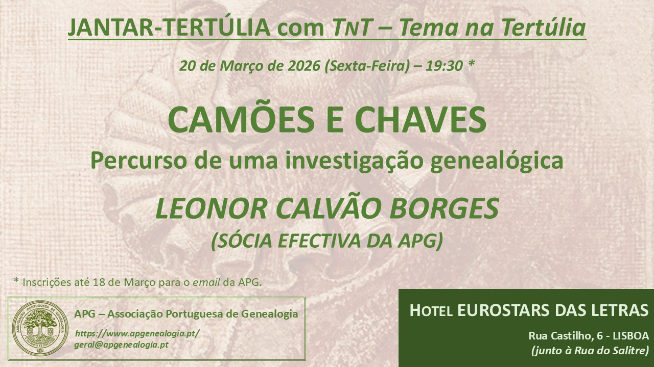 21-03-2025 (6.ª F.) – Jantar-tertúlia mensal de Março com TnT – TEMAS na TERTÚLIA, em que Maria de Lurdes Rosa apresentará o tema “As potencialidades do projeto VINCULUM para os estudos genealógicos”.