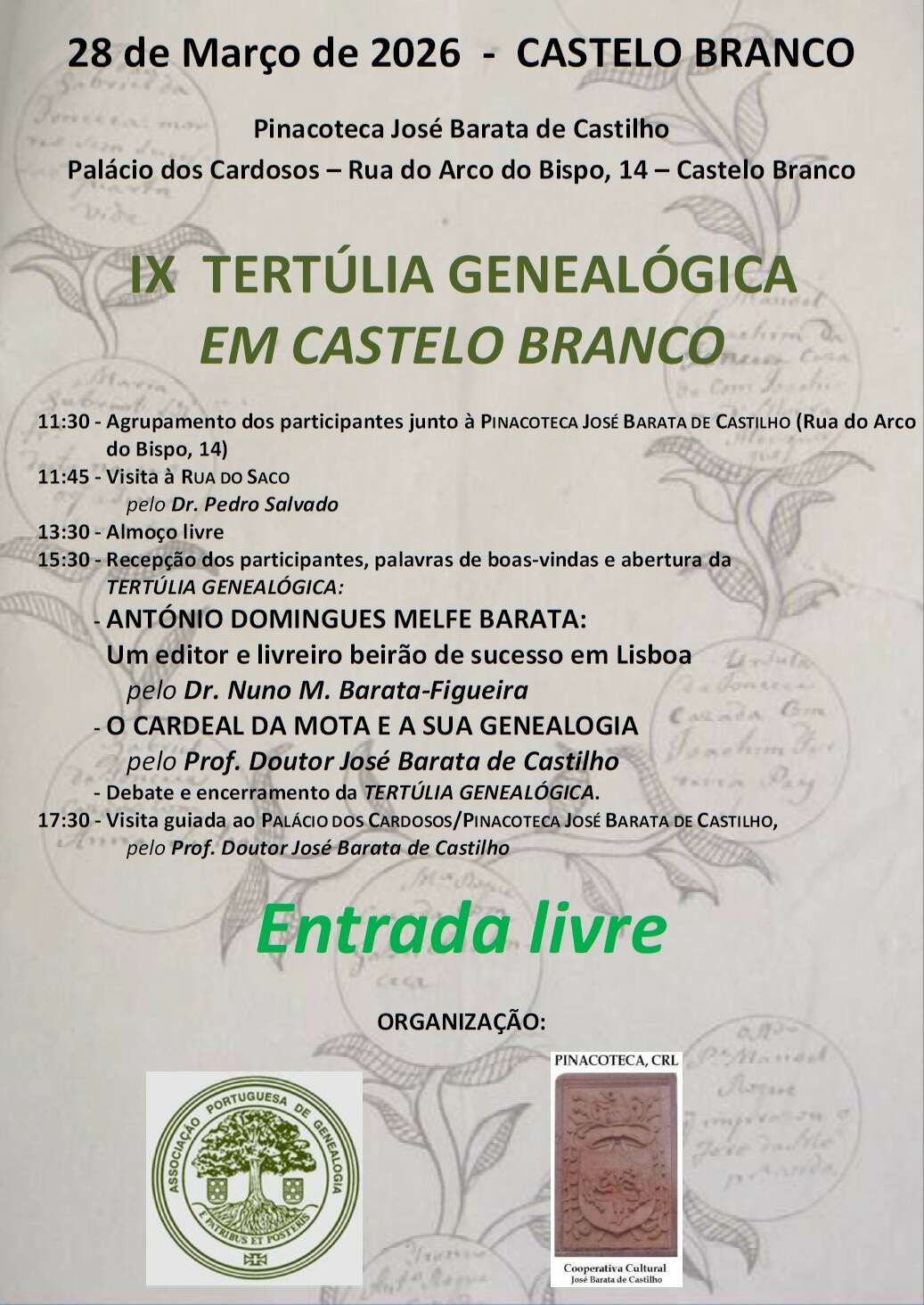 28-03-2026 – IX Tertúlia Genealógica em Castelo Branco, uma organização conjunta da APG e da Pinacoteca José Barata de Castilho.