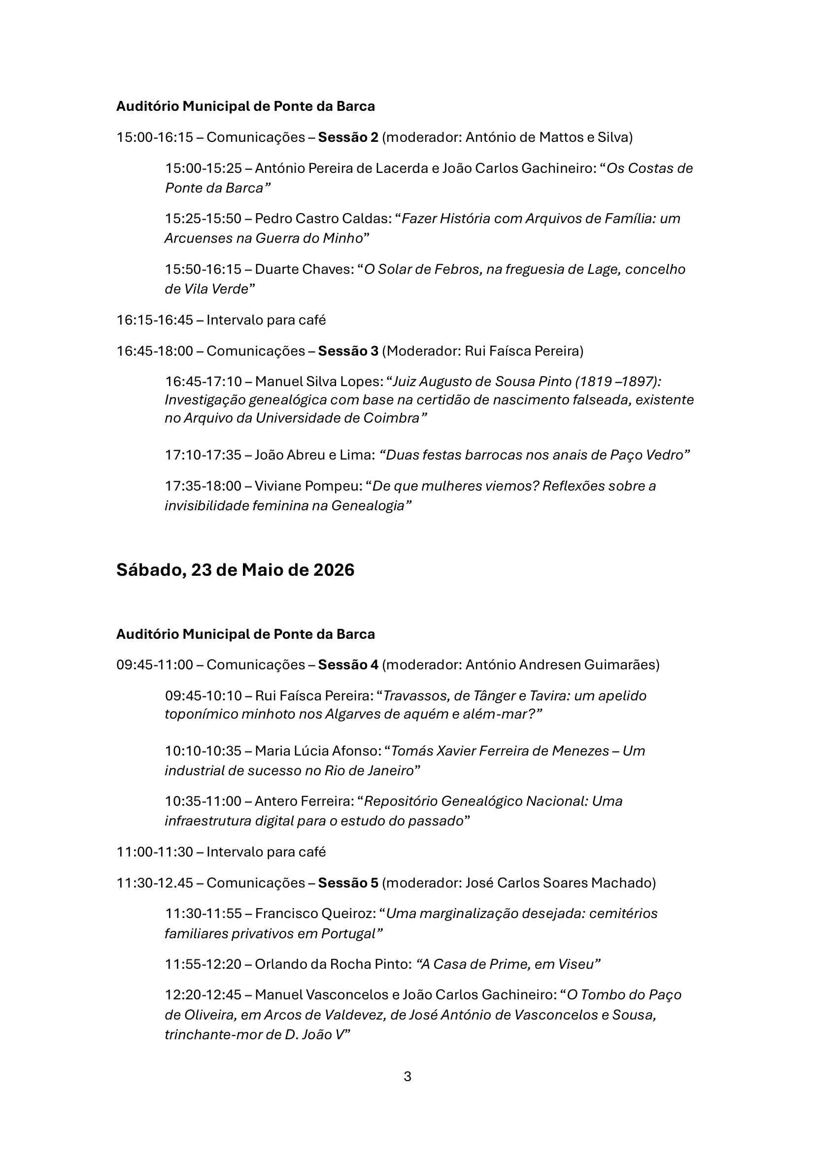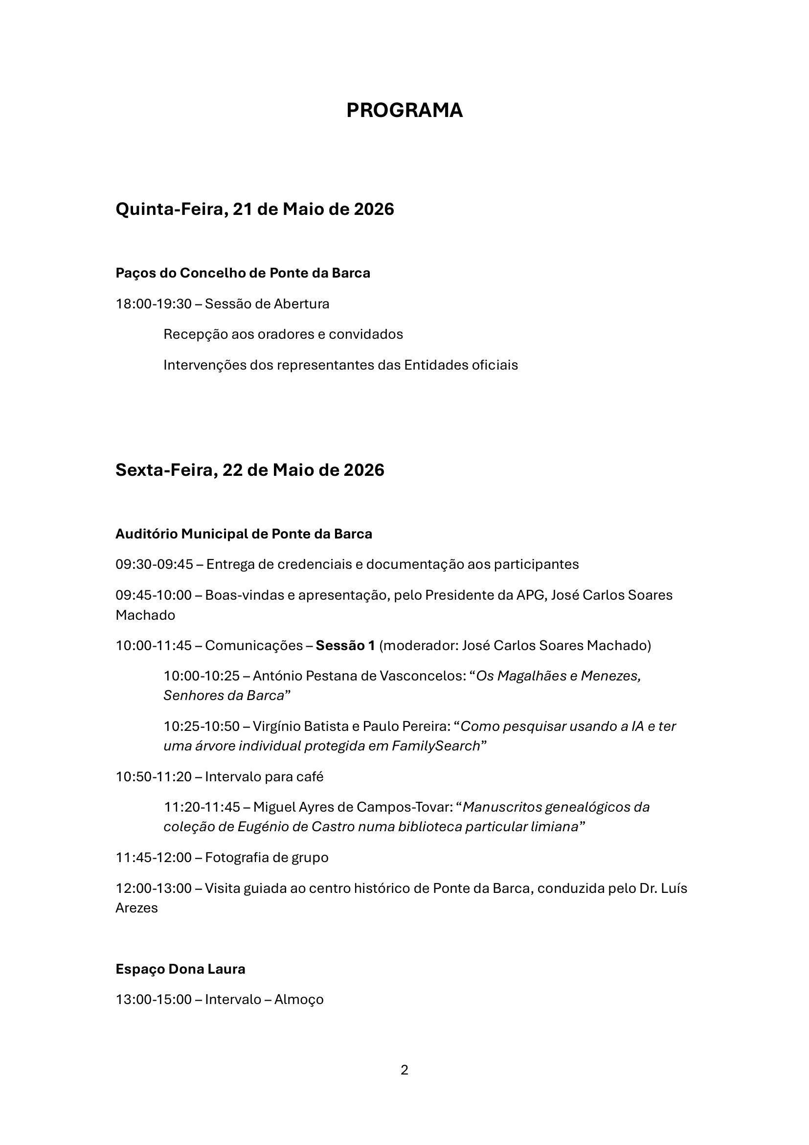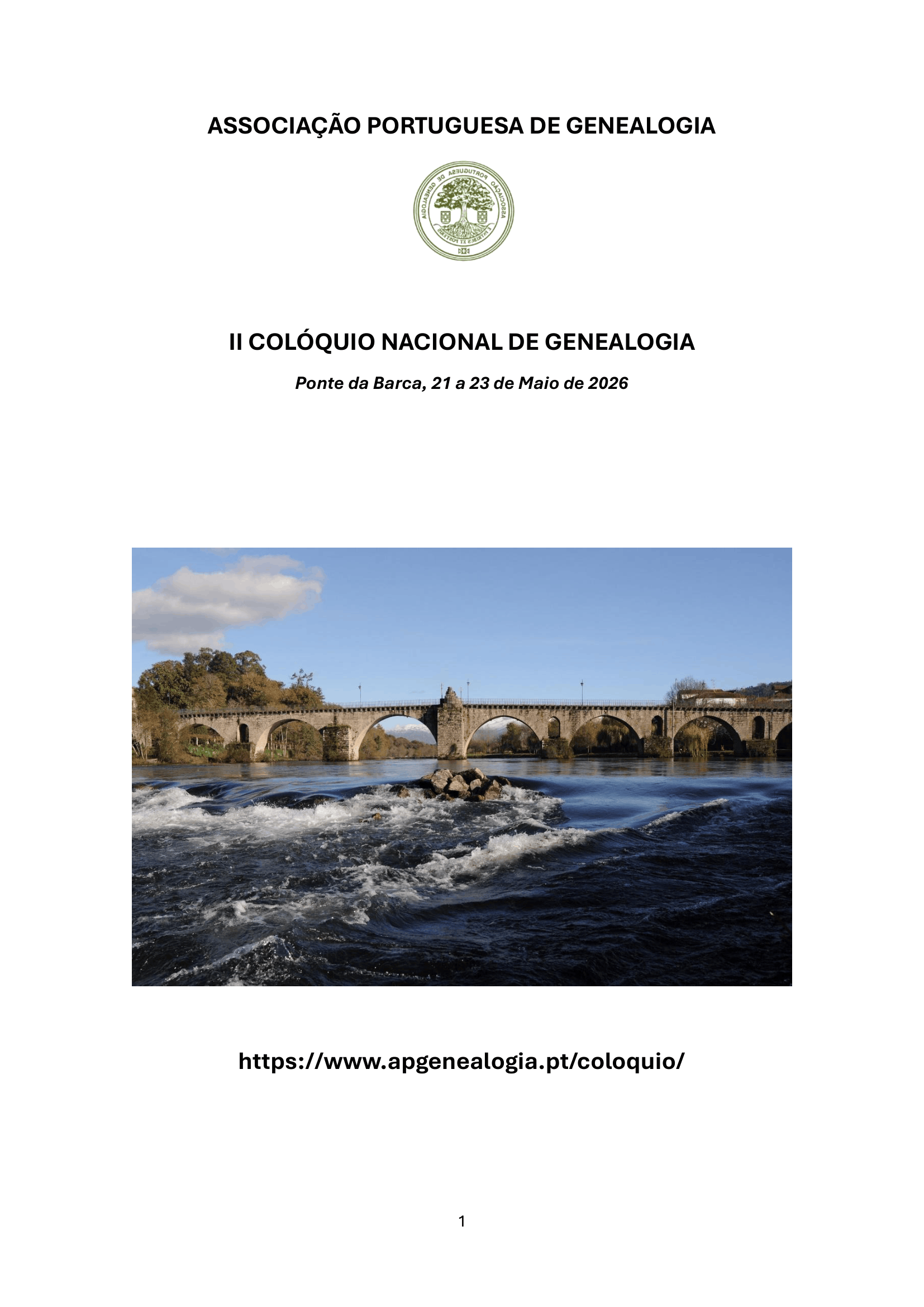 O II COLÓQUIO NACIONAL DE GENEALOGIA terá lugar nos dias 21 a 23 de Maio de 2026 em Ponte da Barca, e é uma organização da Associação Portuguesa de Genealogia com o apoio da Câmara Municipal de Ponte da Barca.
